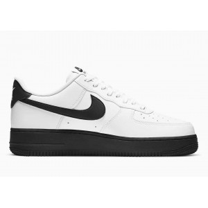 Esta oferta de Nike Air Force 1 07 Bajo Blanco Entresuela Negra para Hombre y Mujer presenta una parte superior de cuero blanco limpio con detalles negros en las lengüetas, los talones, los Swooshes y la suela de goma. El negro reaparece en los talones de la marca y el texto "AIR" en la entresuela.